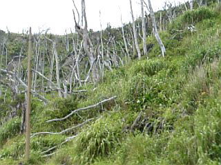 島の木々はみな、火山ガスやらpH2の酸性雨でやられてしまう